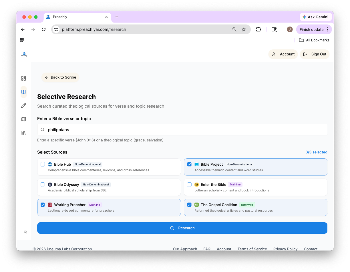 A typical Preachly research workflow looks like the following: